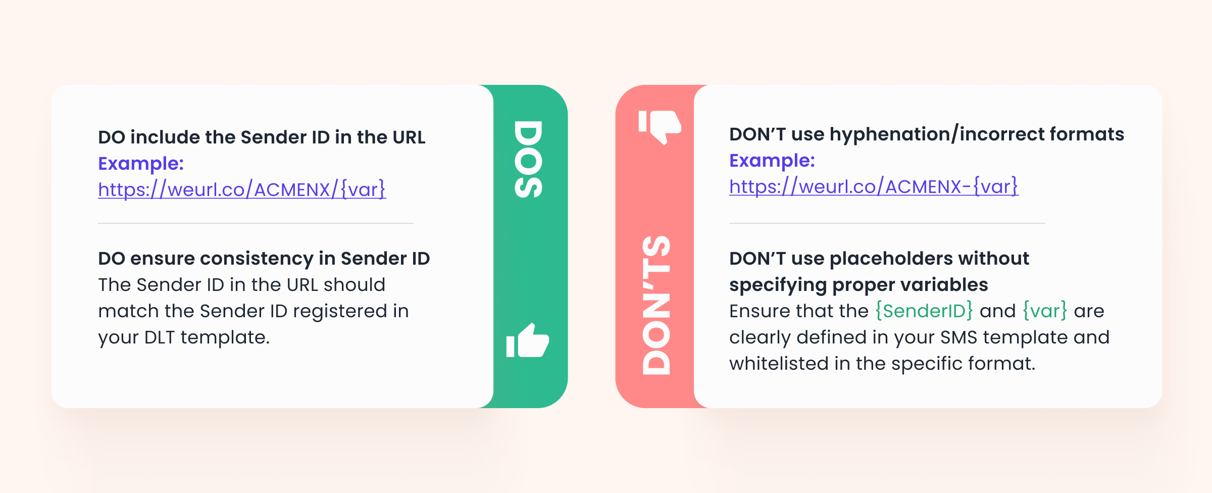 However, in your DLT template, you must format the URL as https://weurl.co/{SenderID}/{var}, including the Sender ID.