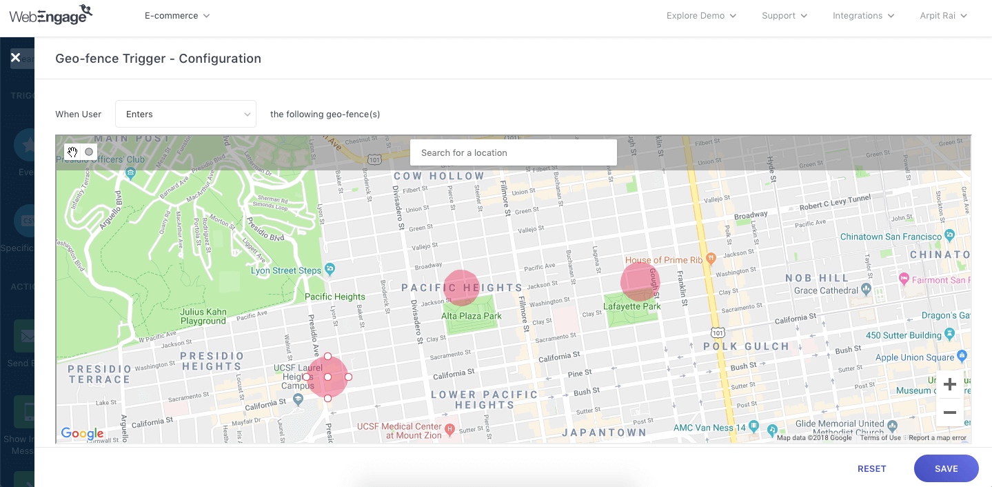 Our new release of the geo-fence trigger block in journeys enables you to do exactly that. You can now trigger journeys when users enter or exit a geo-fence. You can use the regular Google Maps interface within WebEngage to search locations and create a geographical radius around these locations. You can also create multiple such geo-fences in the same trigger block.