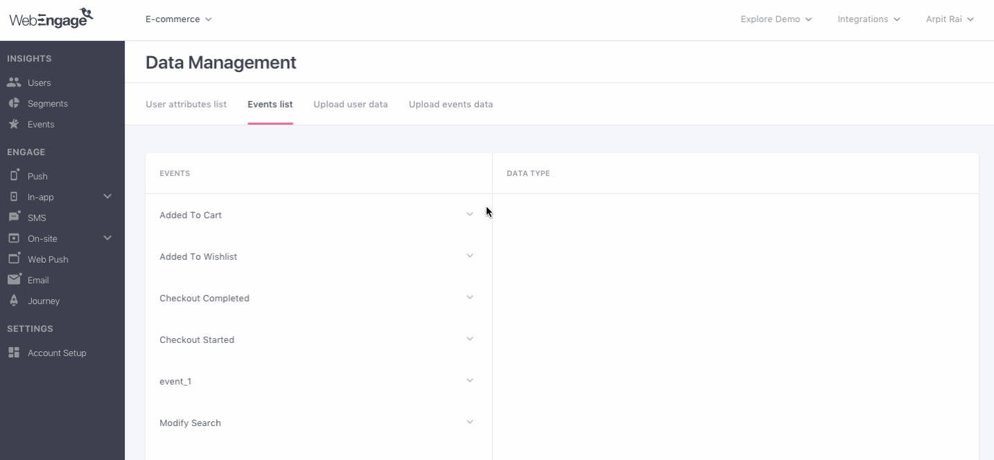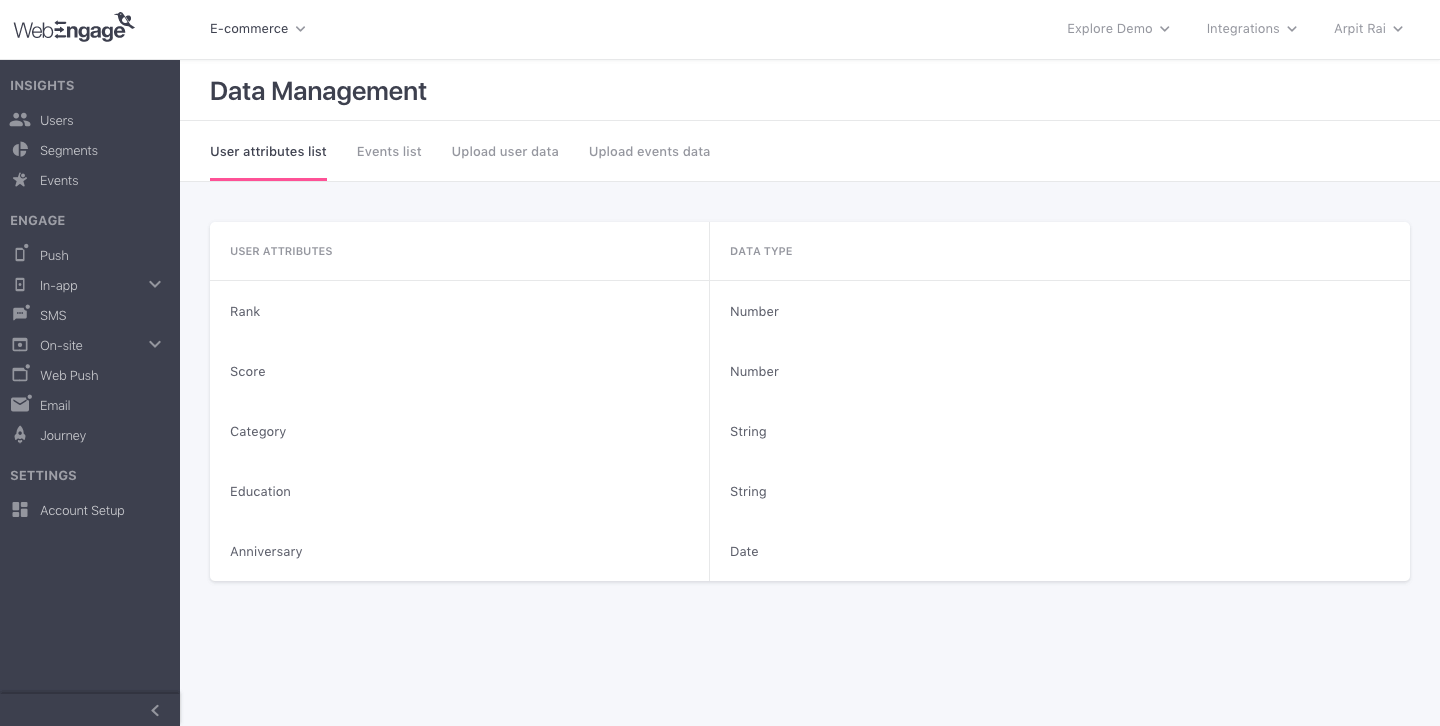 This is mostly a UI enhancement of a feature that was already present in WebEngage. When you go to the Data Management section, you will see two sections there – “User Attributes List” and “Events List”.