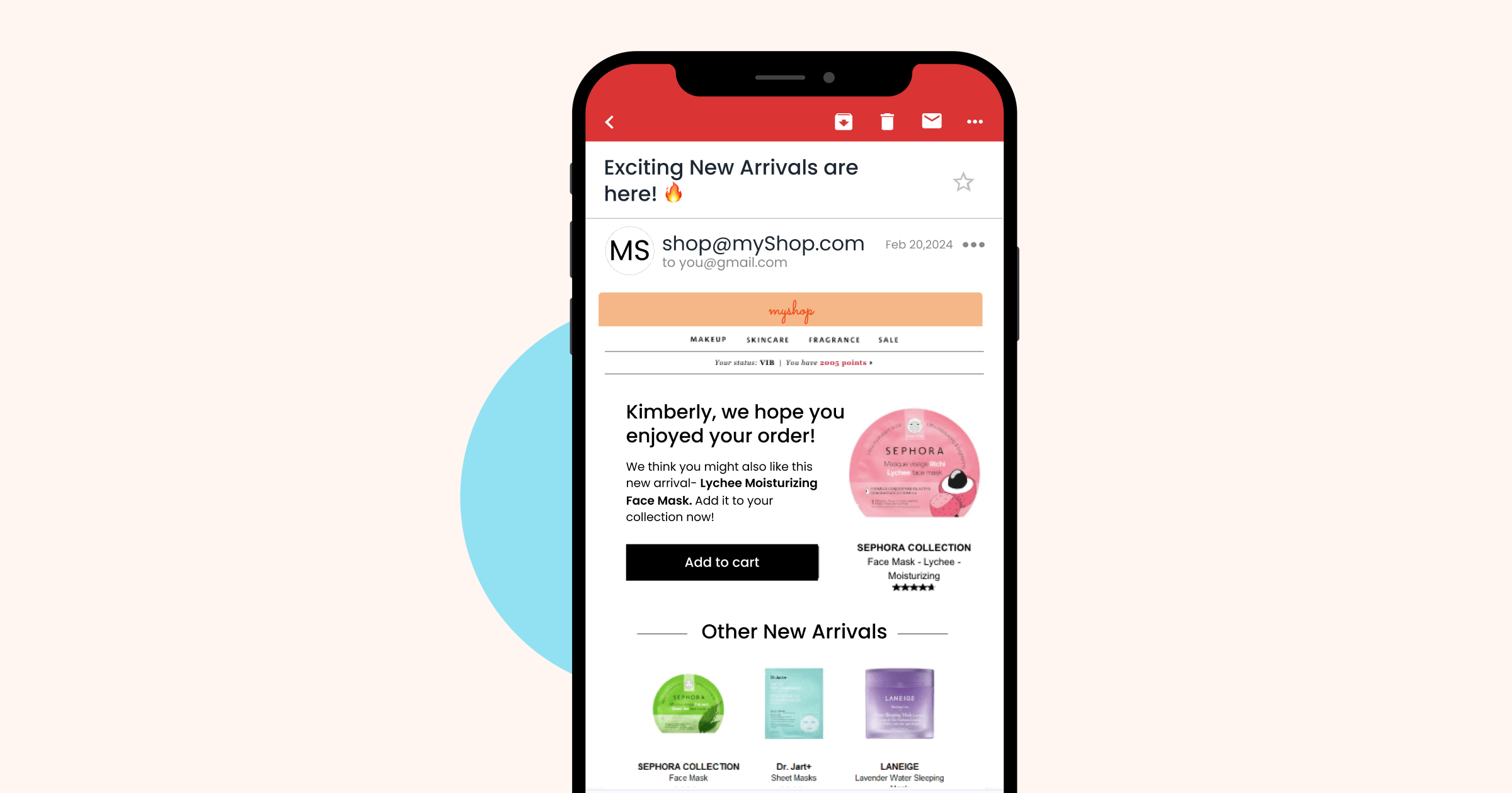 Example: If a customer buys a skincare product, recommend trendy new arrivals in skincare like face masks, sheet masks, etc.