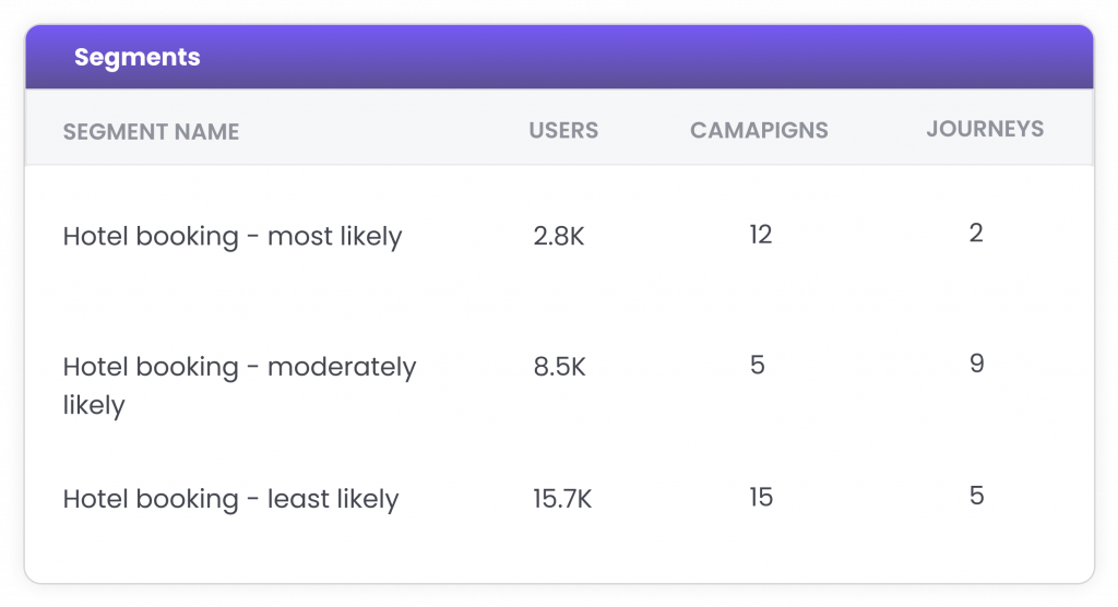 Like creating lookalike audiences, predictive segments leverage machine learning to create a list of users with a ‘likeliness to’ perform a certain action, such as likely to purchase or churn. Predictive segmentation is more powerful than the current segmentation methodology because it relies on a marketer’s ability to segment the audience, restricted to available user attributes and event data.