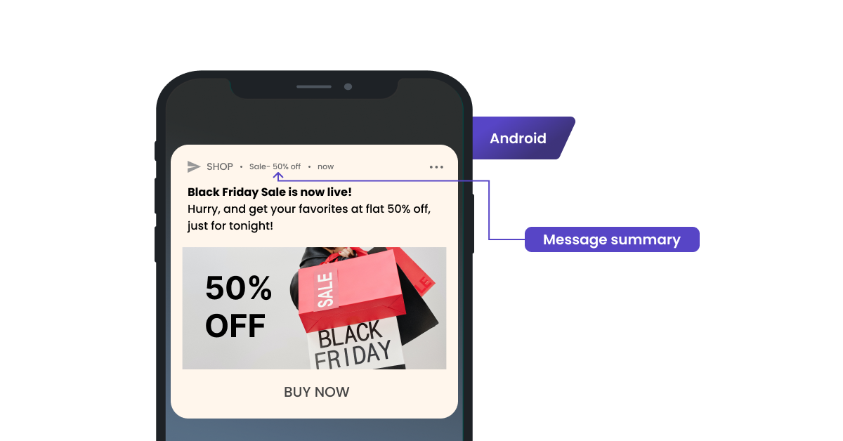 ‘Message summary’ for Android: Let’s you add a message summary for Android devices. When a notification is in the inbox with other notifications, rich media such as images are not displayed unless expanded. A message summary can be helpful in conveying additional information that otherwise could be missed. The screenshot below shows where the message summary appears.