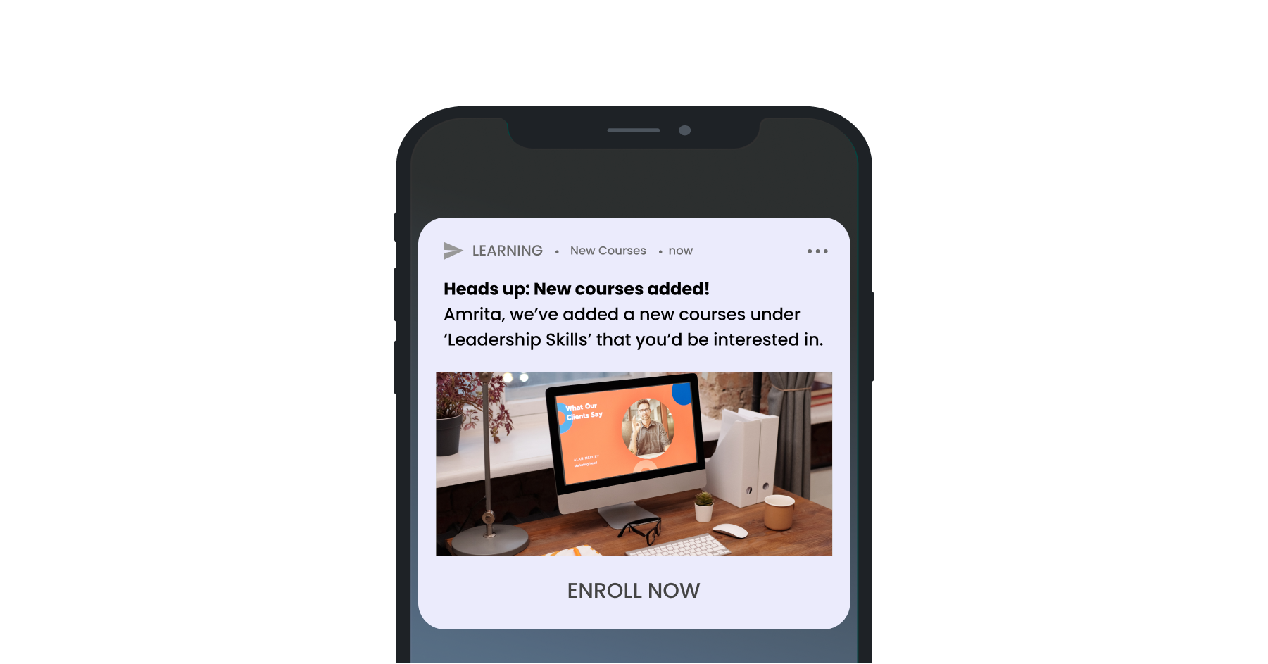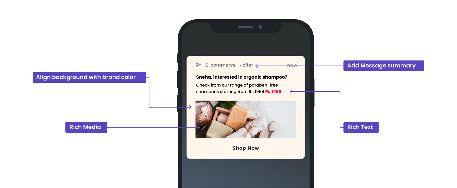 Leveraging rich media can help you send a more visually appealing notification. Moreover, you can use rich media such as images, carousels, ratings, and more to send relevant information. For example, an E-Commerce brand could use images to display products abandoned in a cart and nudge users toward a purchase.
