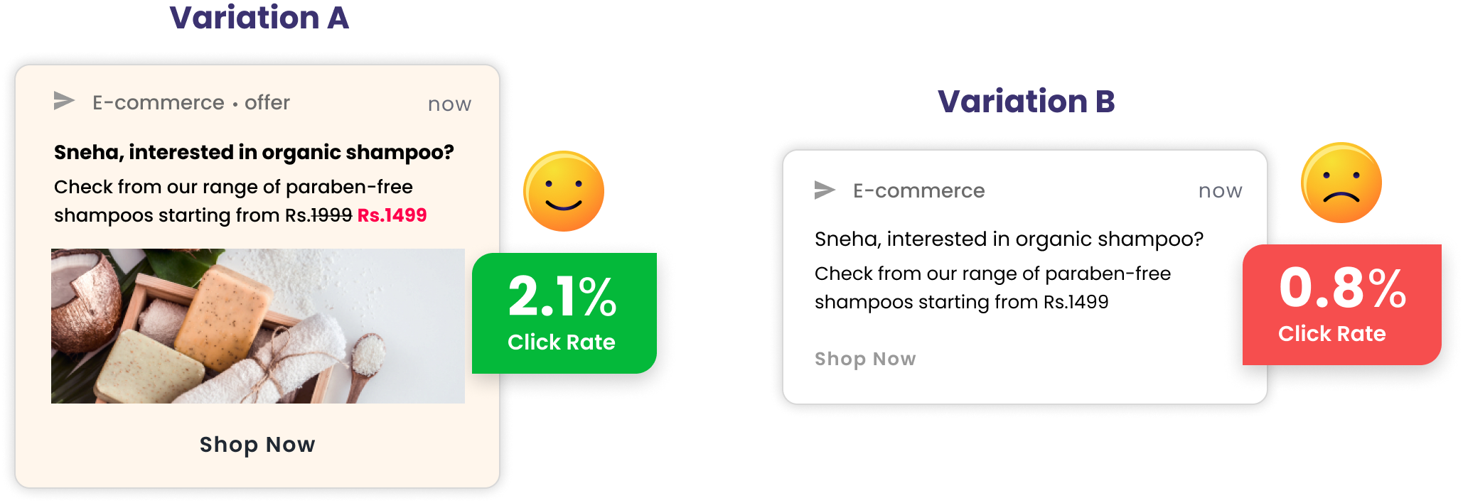It is difficult to pinpoint factors that contribute to the success of your push notifications. Therefore, as a best practice, it is beneficial to continuously test different variations of your message and experiment with different message strategies. You can set different versions of your push notification message, allocate variation distribution, and also auto-select winning variation.