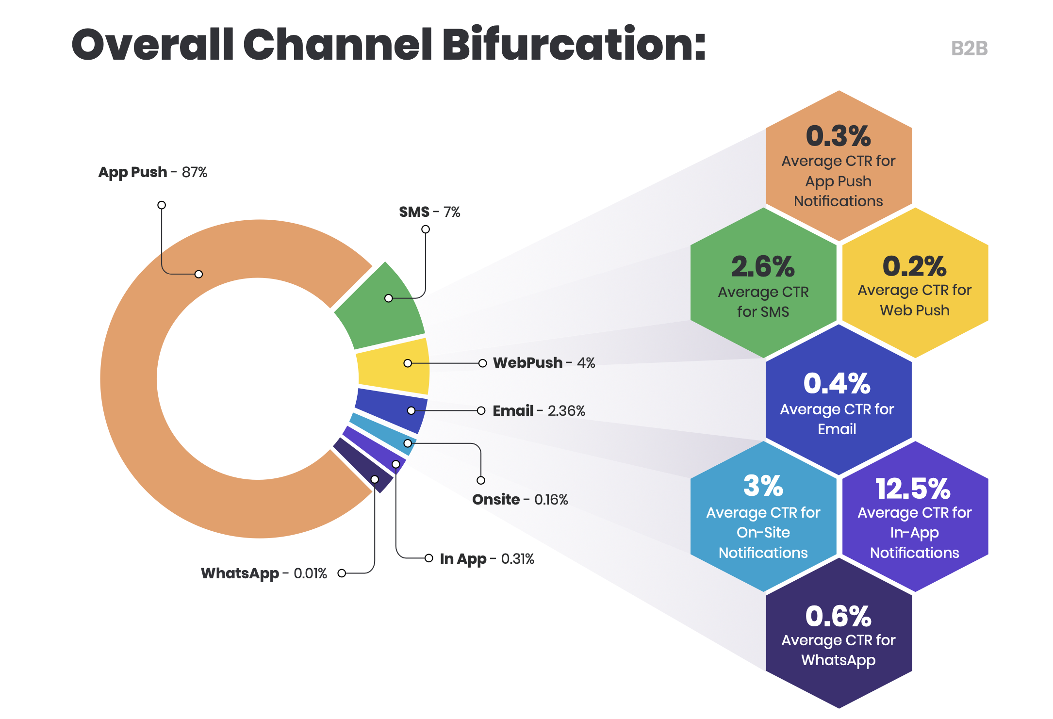 Besides B2B, push notifications have also emerged as a widely used channel in the consumer market. Here’s the overall channel bifurcation –