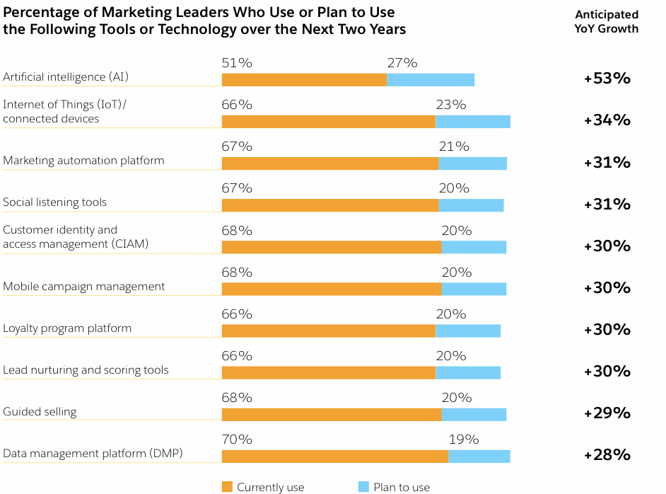 A report released by Salesforce titled State of Marketing (2017) states that 67% of marketing leads are currently using some type of marketing automation platform. The biggest growth in usage is seen in areas like Internet of Things (IoT) and artificial intelligence.