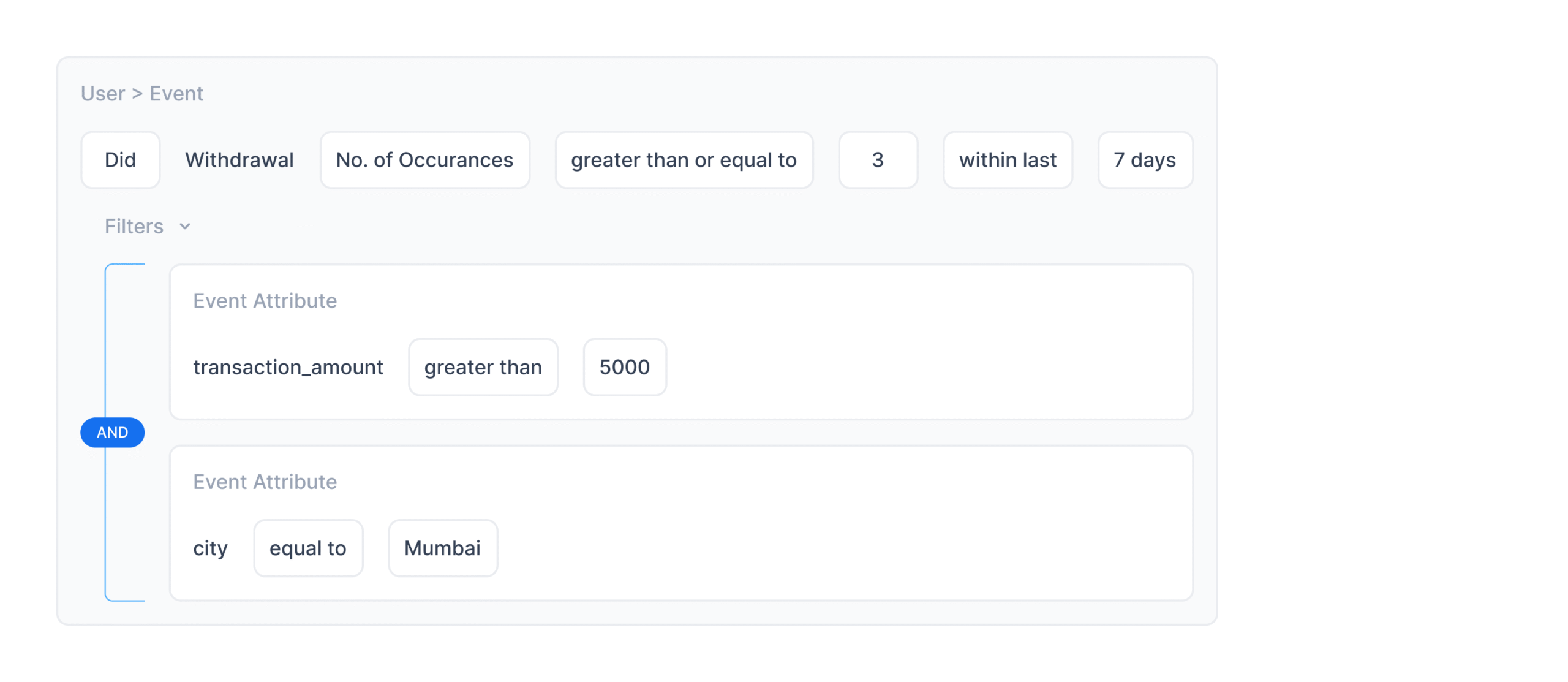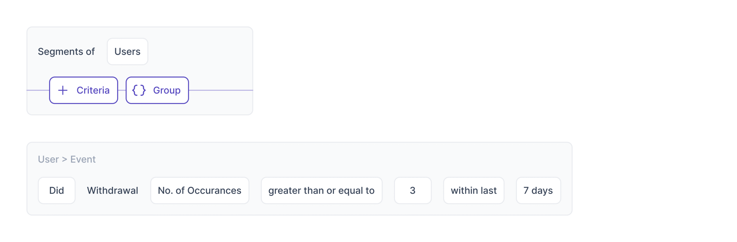 Example: Segment: “Users who have made >3 withdrawals in the last 7 days” Add an event → Withdrawal → Count > 3 → Last 7 Days.