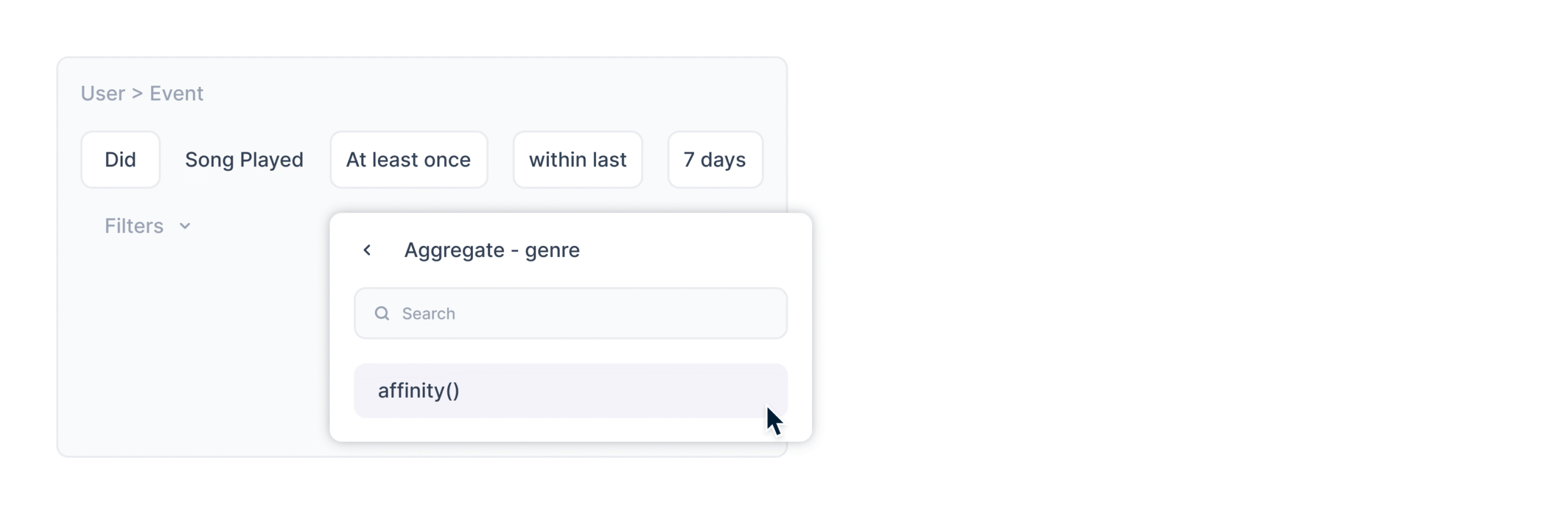 - affinity(category) equals “Electronics” → Users whose strongest interest is Electronics