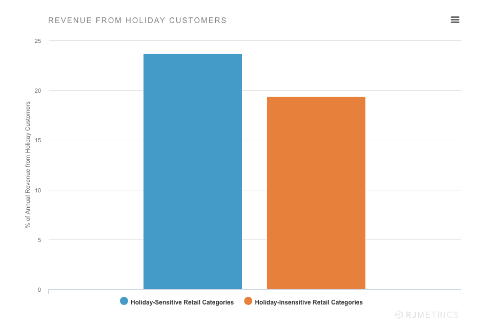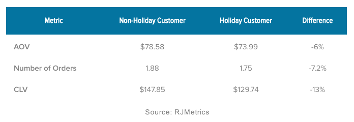 According to the recent report The Ecommerce Holiday Customer Benchmark by RJMetrics, Holiday Shoppers have 13% lower Customer Lifetime Value (CLV) and are not worth a lot. This can be proved with this break-down: