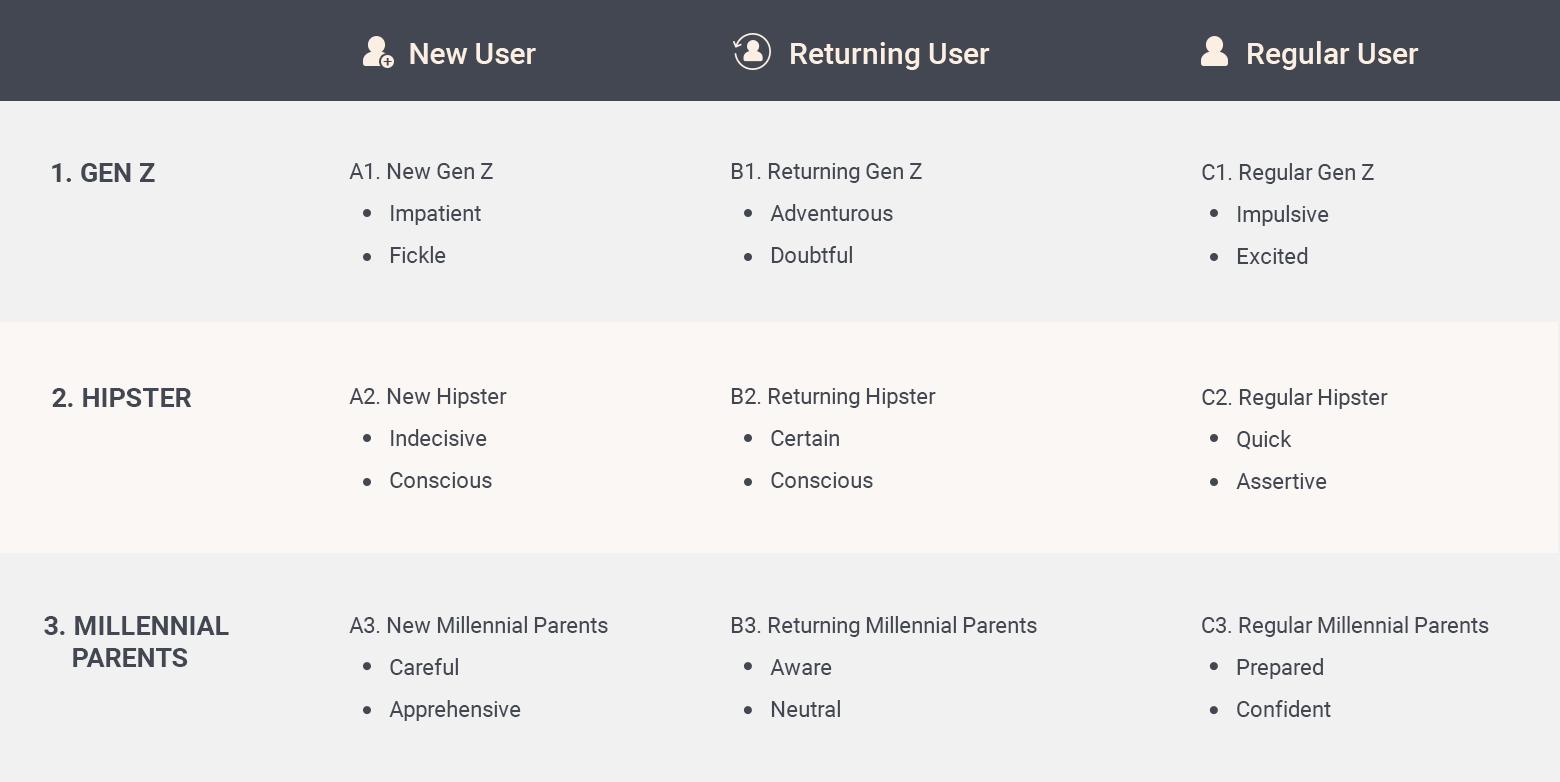Once you have that in place, choose any two categories whose interlinking will create a reasonable set of customer segments for you. For instance, I’m using ‘Age’ and ‘Purchase Behaviour’ and presenting them in a tabular form to create 9 new customer segmentation models along with their basic characteristics.