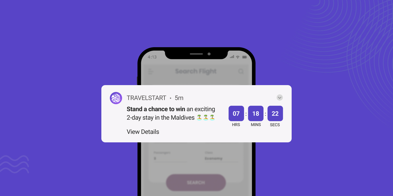 The chances of winning a trip, cruise, vacation, or getaway are already intriguing to users, but adding a time limit on such opportunities can help take them up a notch. An eye-catching, engaging timer Push Notification with attractive colors, catchy text, and the right image can act as the final nudge needed!