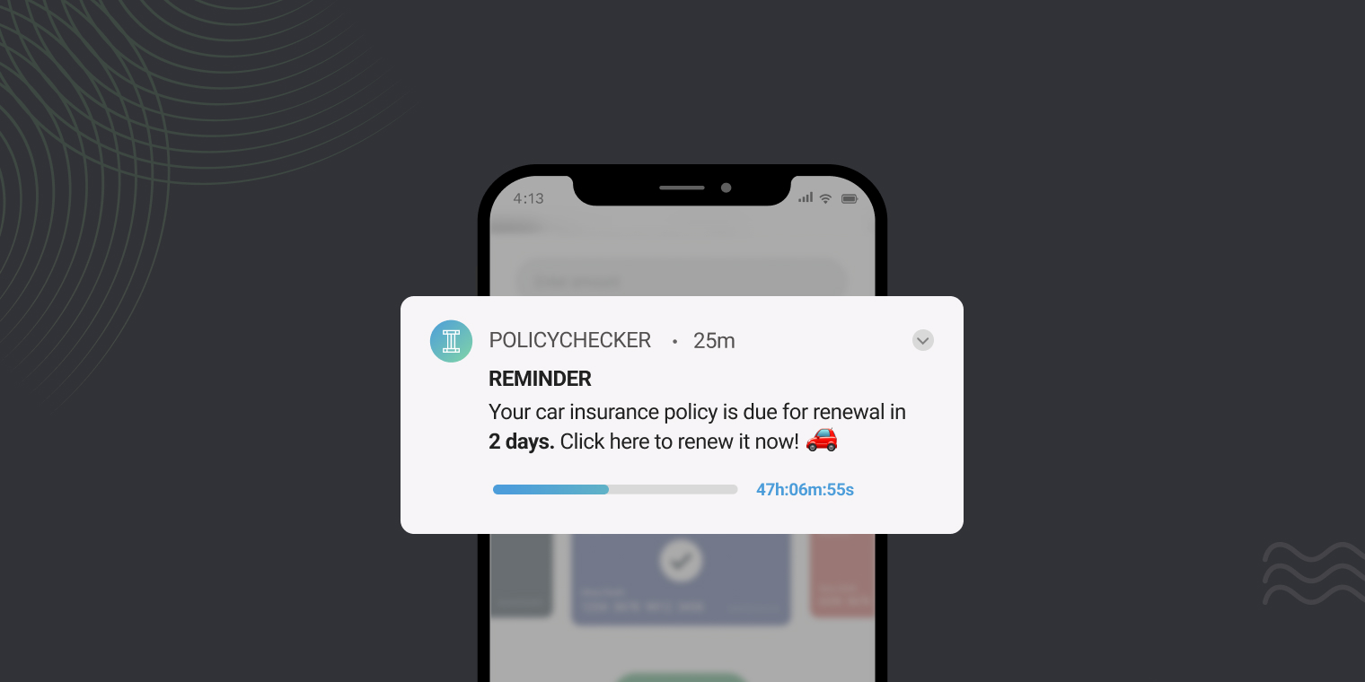 For example: You want to alert users that their insurance expires soon and remind them to renew it. Specify the name and date of the insurance lapsing, the Progress Bar depicting the time left, and a CTA for renewal. This way, you can re-engage them for policy renewal and add any special offers to help build a sense of loyalty.