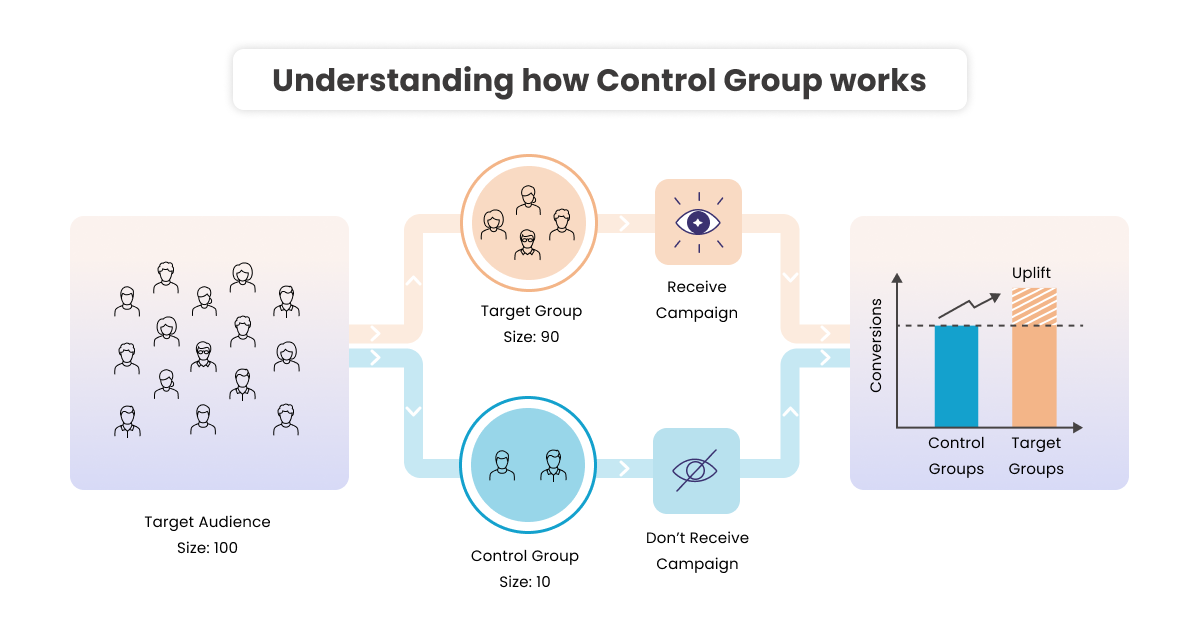 Further, to measure a control group’s impact, KPIs such as conversions, website or page visits, revenue, and more should be considered to understand the impact or uplift. In our example above, if you select conversions as your KPI, then comparing conversion rates between 9000 who receive the campaign vs 1000 users who don’t will help you understand the uplift your promotional campaign was able to create.