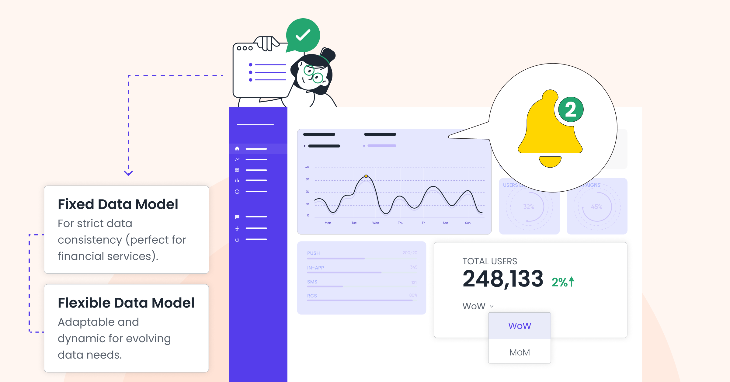 - Week-over-Week (WoW) and Month-over-Month (MoM) insights for DAU, WAU, MAU, and channel reachability.
