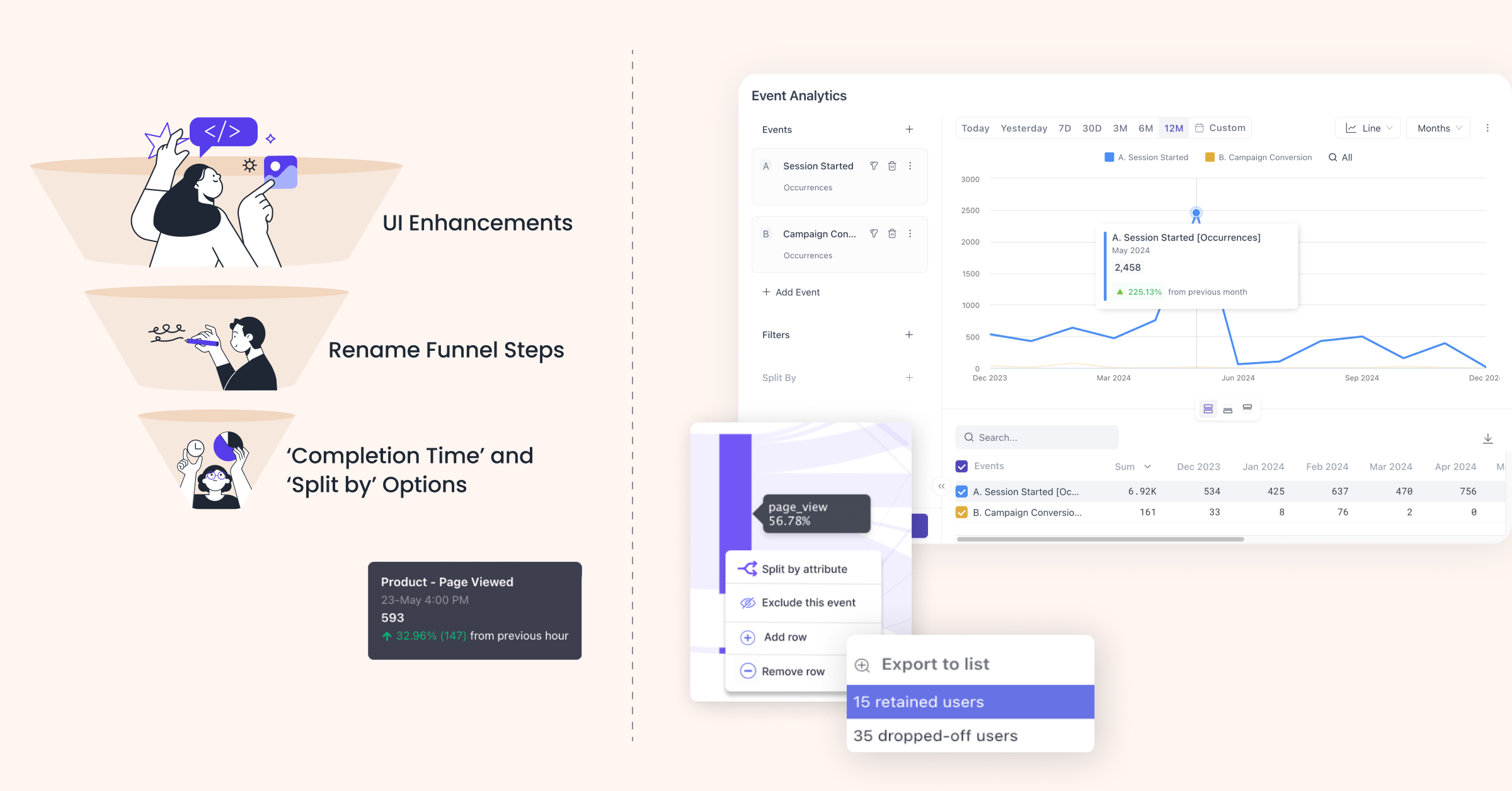 - Completion Time and Split By Options: Add “Completion Time” and “Split By” options for deeper funnel analysis, tracking time spent on steps and splitting data by metrics like demographics.