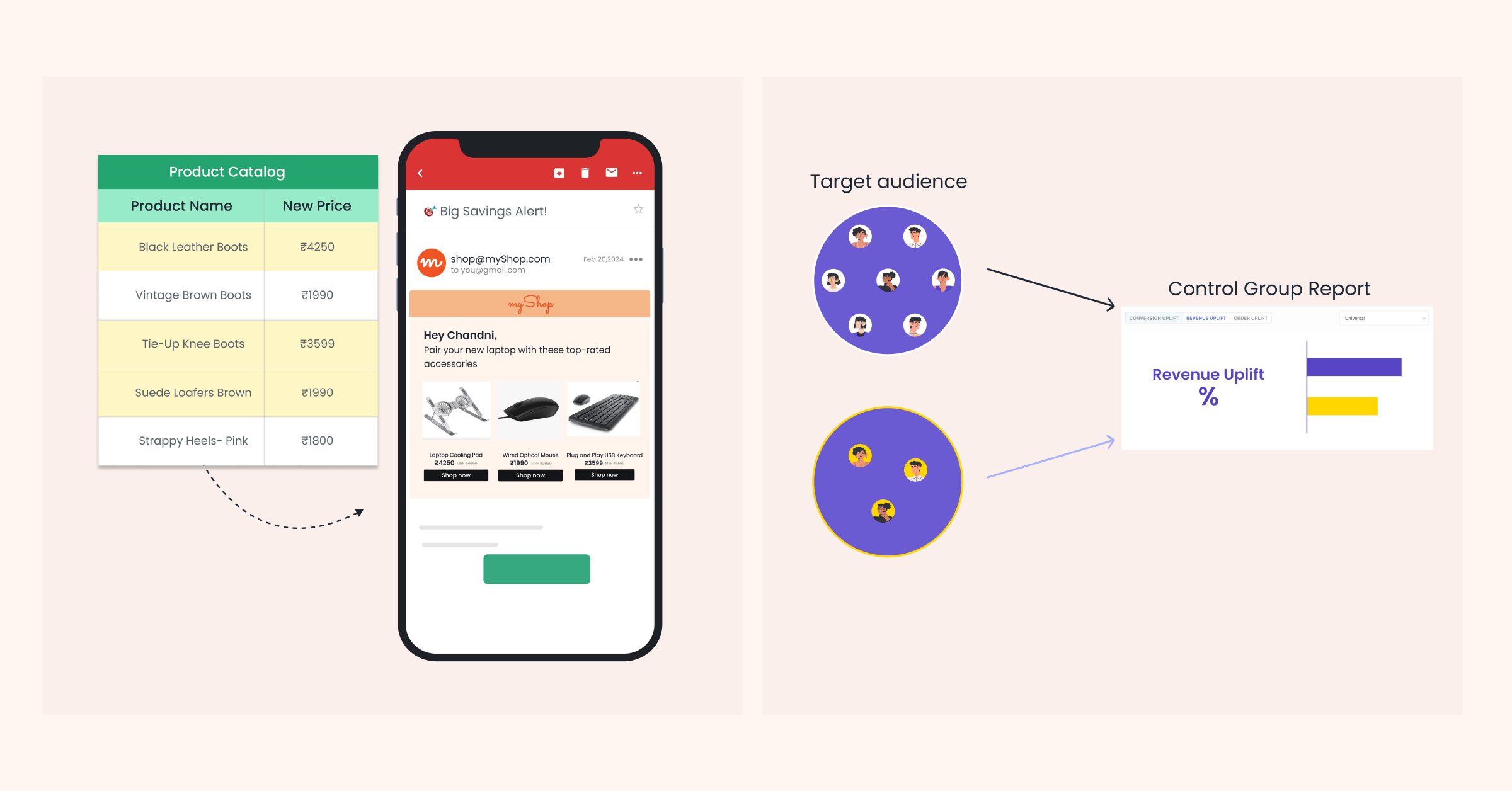 Automate campaigns using real-time inventory updates for events like “Back in Stock” or “Price Drop.” Deliver timely, targeted messages to drive higher conversions and keep your communication relevant.