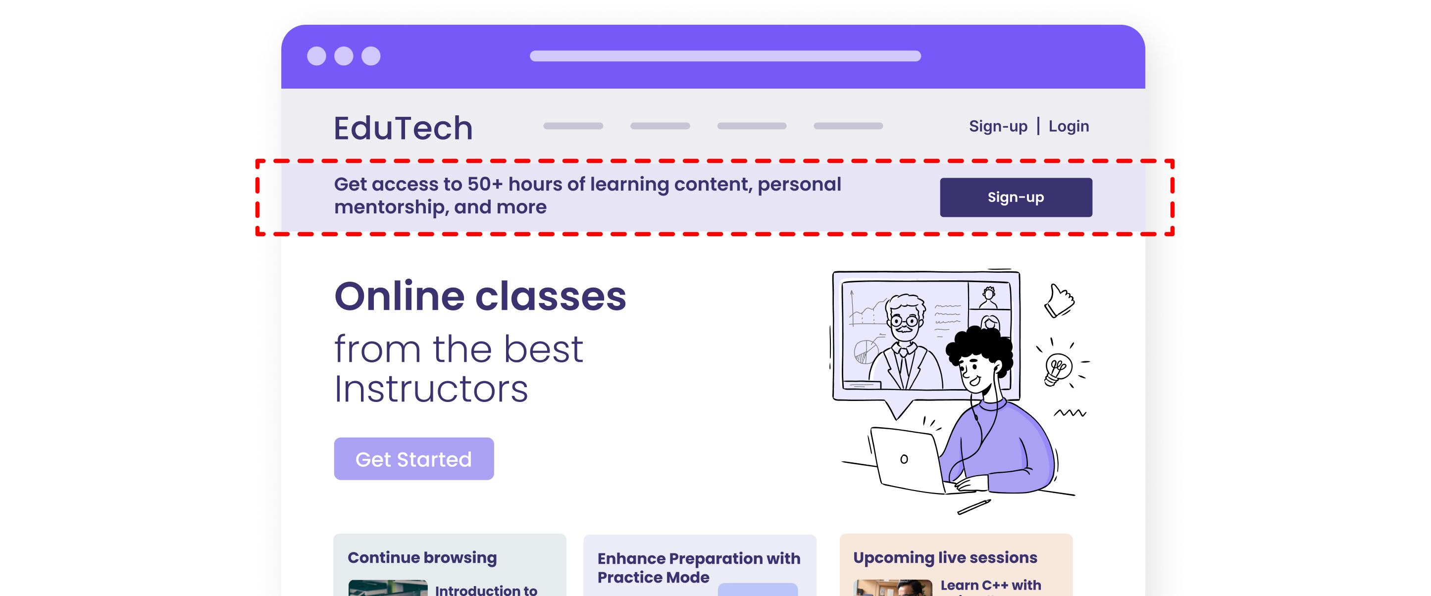 Identify unknown users and nudge them to sign-up. Provide an additional incentive if needed. In the example above, a personalized banner is displayed above the hero banner and aims to drive successful user sign-ups on the platform.