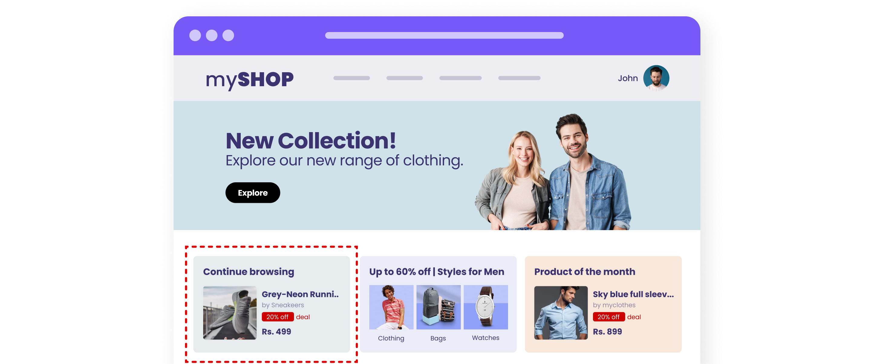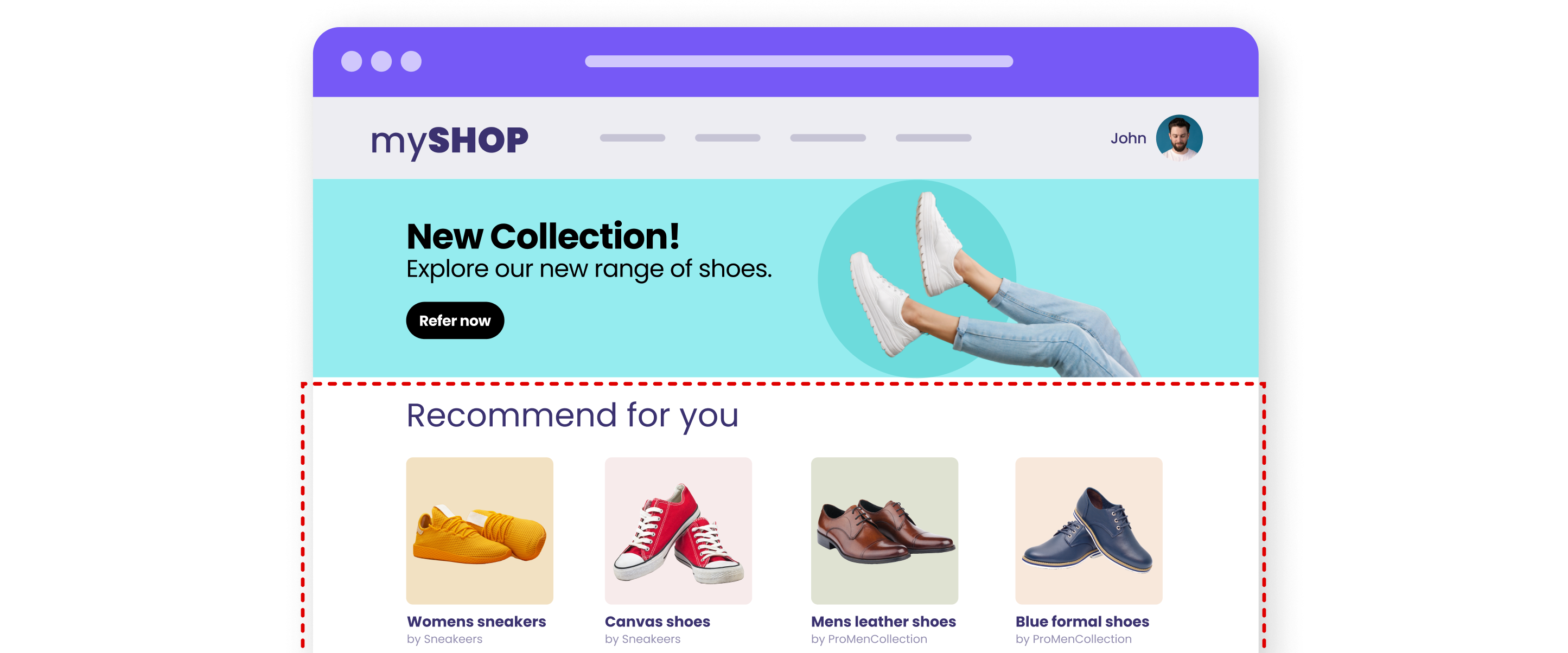 62% of global shoppers find recommendations helpful. With web in-line campaigns, you can leverage our recommendation engine to show personalized banners to your users on the website. The example above shows a recommendation banner based on a user’s previous purchases.