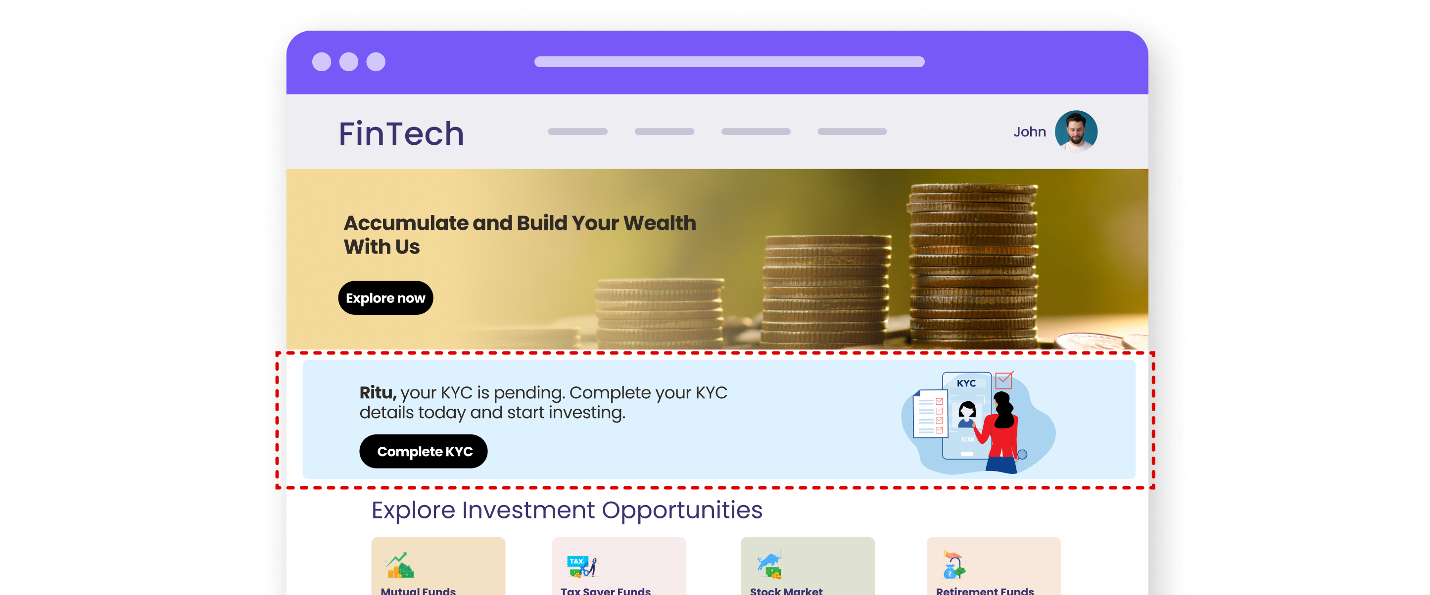 For a fintech platform, getting users to complete the KYC process can be tedious. With the help of a web in-line campaign, you can nudge users when they login to your platform. The example above shows a personalized nudge to complete the KYC process below the hero banner.