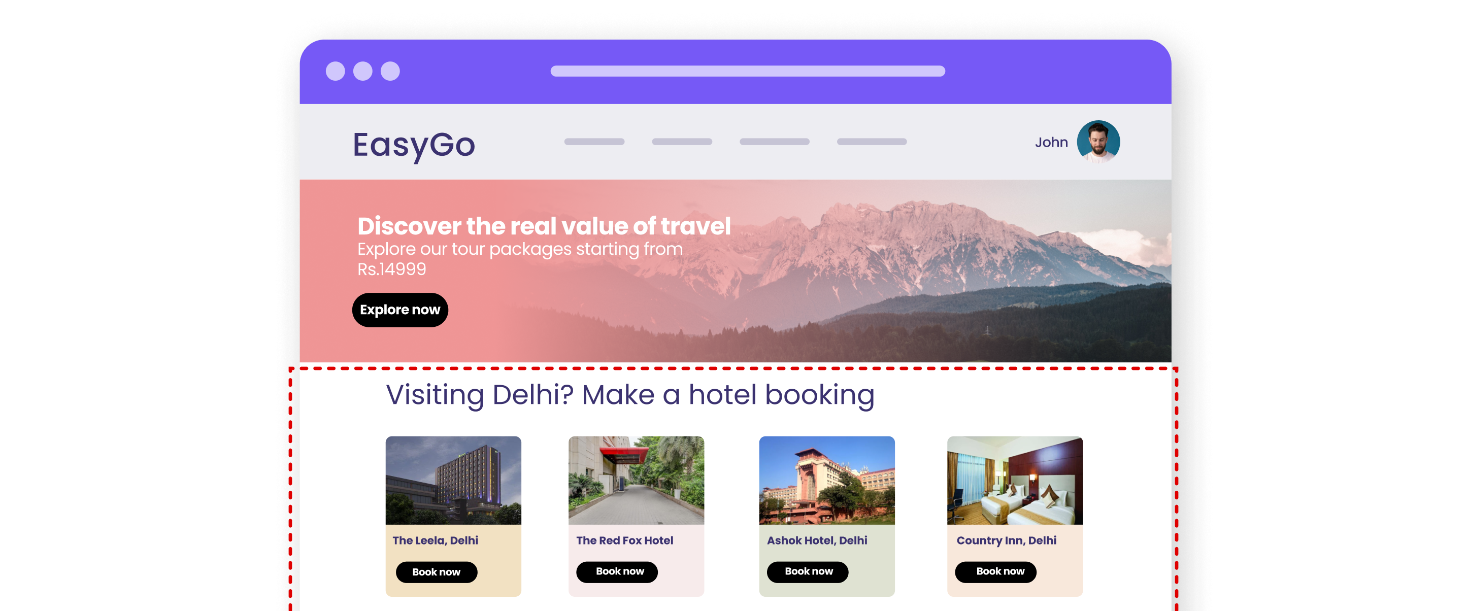 Identify users who made a recent flight booking and show a personalized banner based on their travel destination, highlighting top hotel options. The above example shows hotel recommendations based on a user’s destination to Delhi.