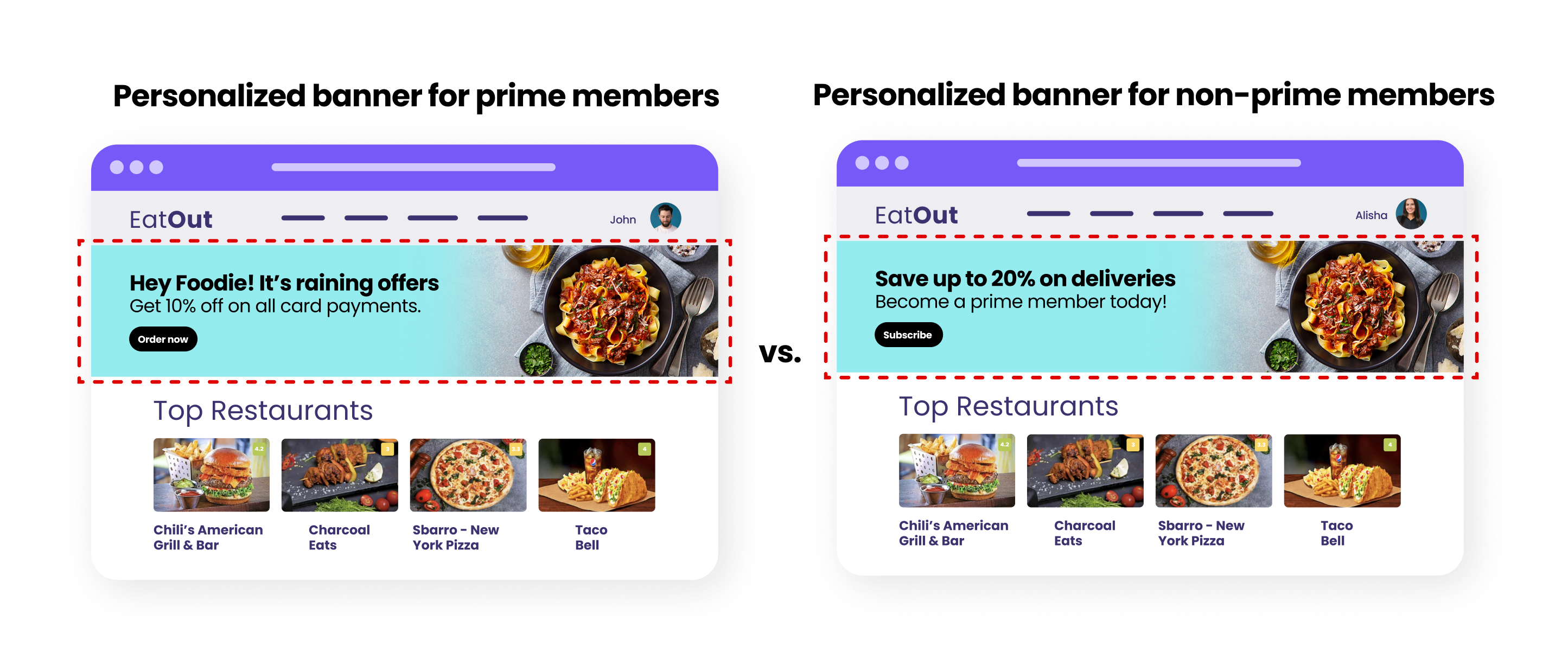 Through user attributes such as subscription status, location, gender, and more, you can show personalized banners and direct users towards the desired step based on user attribute values. The example above shows how a prime member experiences your website vs. a non-prime member.