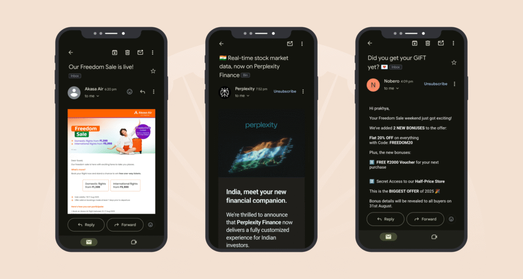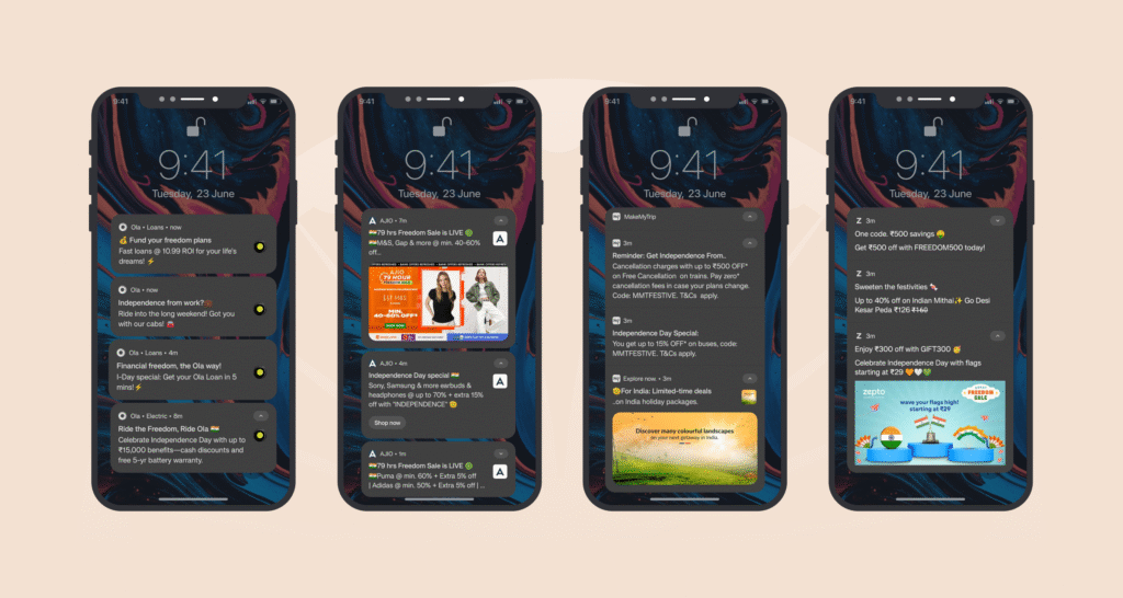 - Criteria: Only explicitly Independence Day themed campaigns (tricolor creatives, “Freedom” messaging, timed offers).