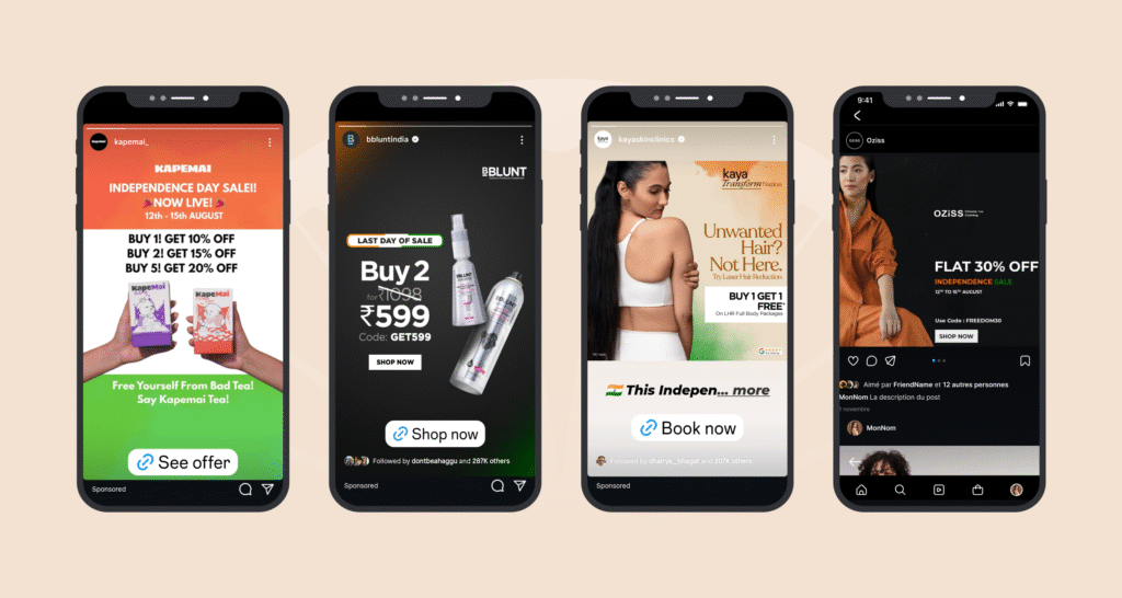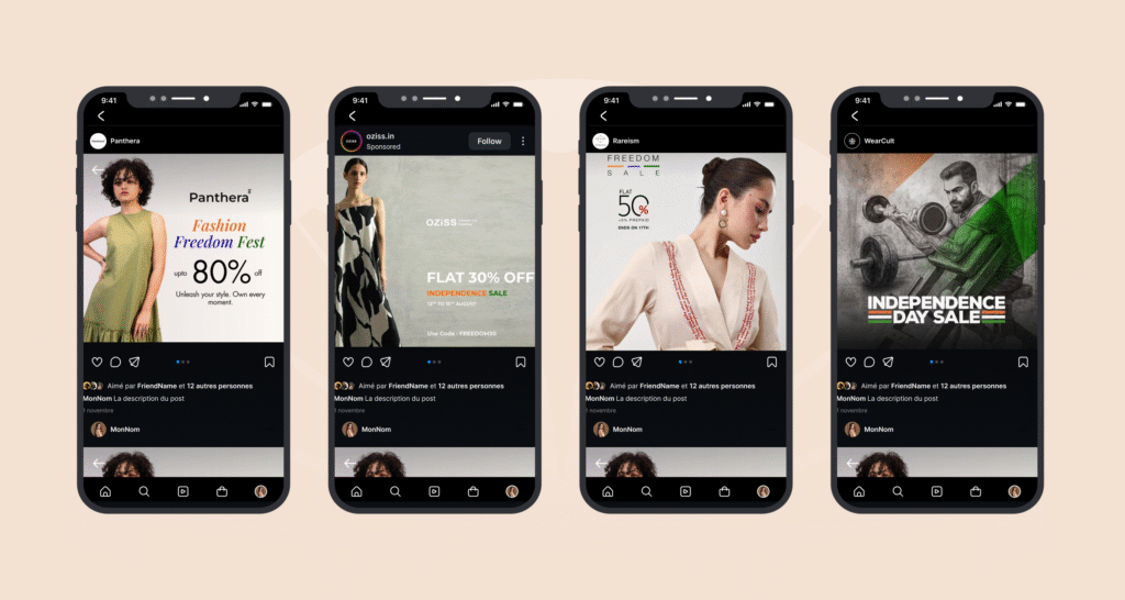 What I saw: Static images with discounts and festive greetings. Some leaned on tricolor visuals, others just slapped a % off badge.