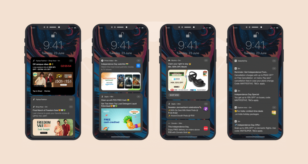 Insight: Push works best when anchored to user behavior. Example: Ola → “Freedom from waiting, your cab is 5 mins away.” MMT → “Freedom fares for your saved Goa search.” That’s the next level.