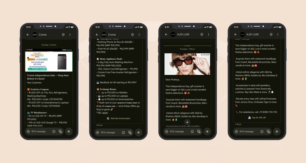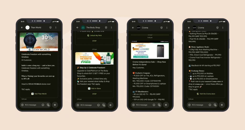 - SMS / RCS: Croma (TATA Enterprise), Titan World, Ajio LUXE, The Body Shop