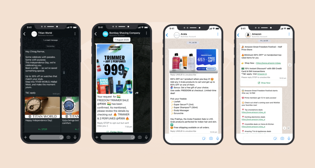 - WhatsApp: Arata, Bombay Shaving Company, Amazon, Titan World