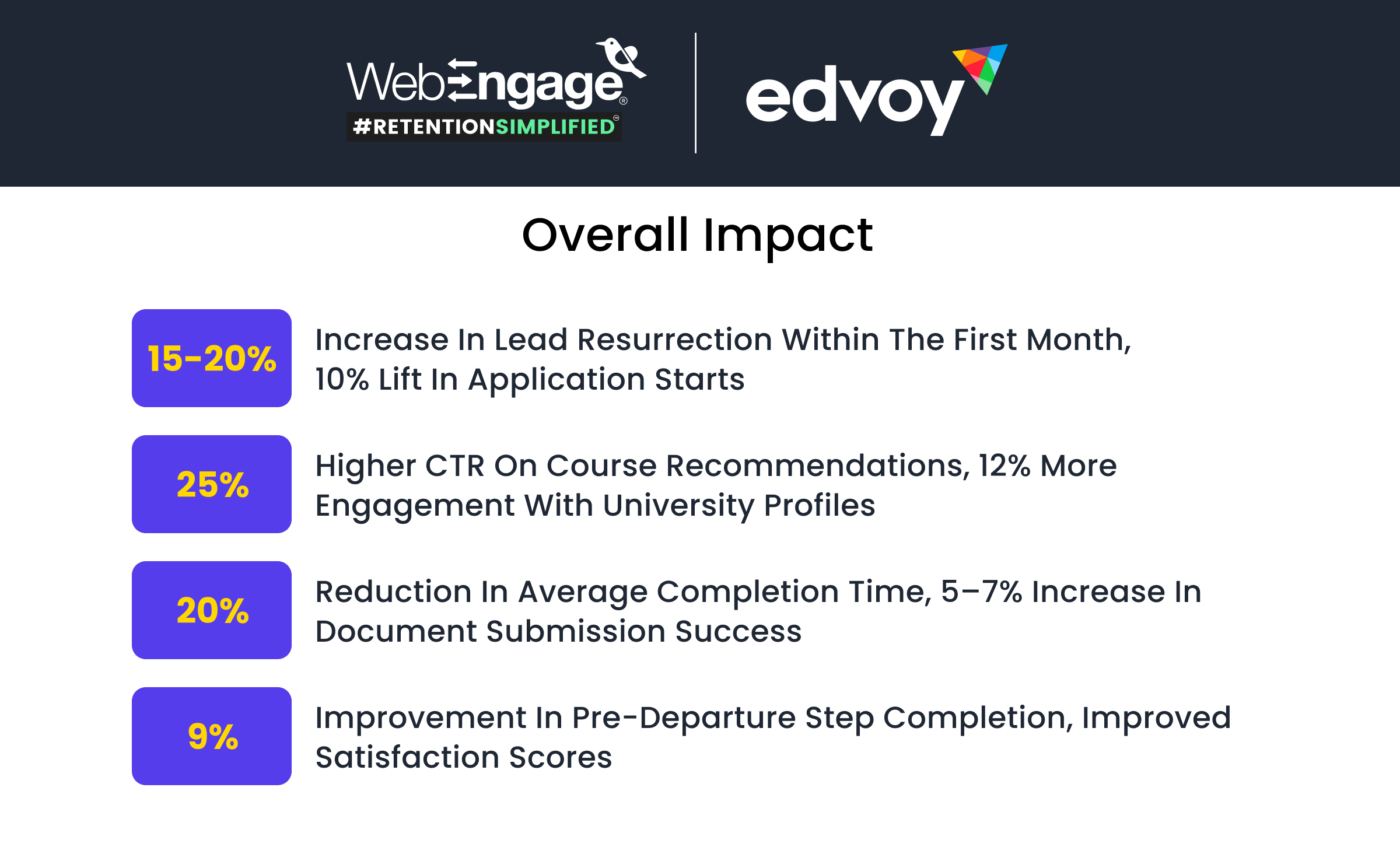 - Solution: Automated, stage-wise journeys nudged students on next steps—documents, visa, interview prep