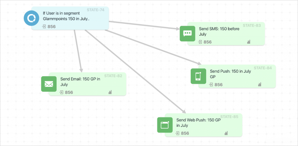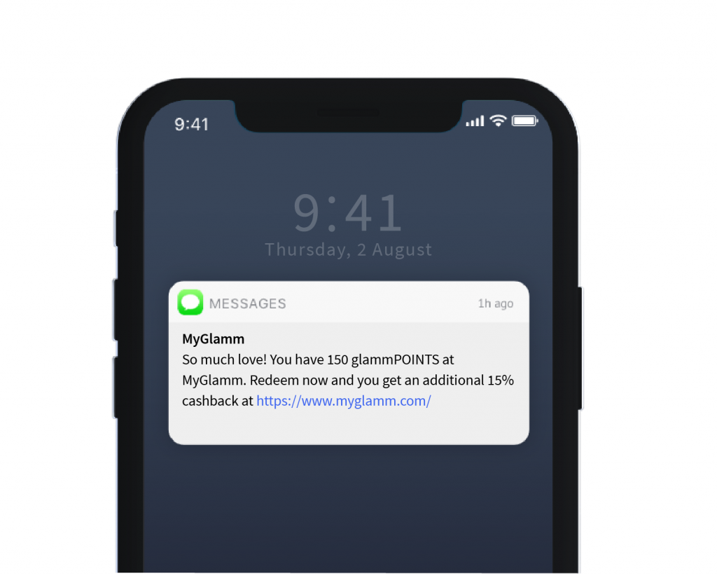 - As soon as a user (in this case, Jane) entered the segment, an SMS (about glammPOINTS i.e. store credits) was sent to that user.