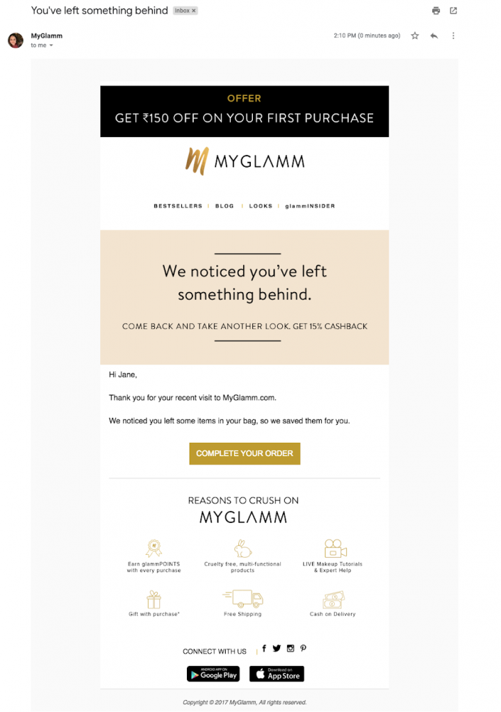 MyGlamm did just that. They built an event-triggered journey for all those users who added products to their cart but did not purchase those products within the next 30 minutes.