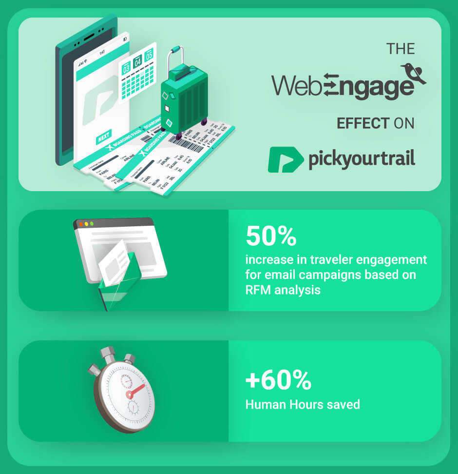 With the help of RFM segmentation and automated traveler engagement workflows, the team at Pickyourtrail has been able to retain its travelers. And also save a considerable amount of manual effort usually required for campaign execution. Pickyourtrail witnesses some fantastic results.